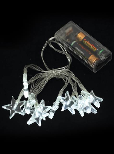 Lieferumfang: Girlande 150 cm mit 10 Sternleuchten mit kaltweißem Licht mit Dauerlichtfunktion. Wird mit 2 AA Batterien betrieben.